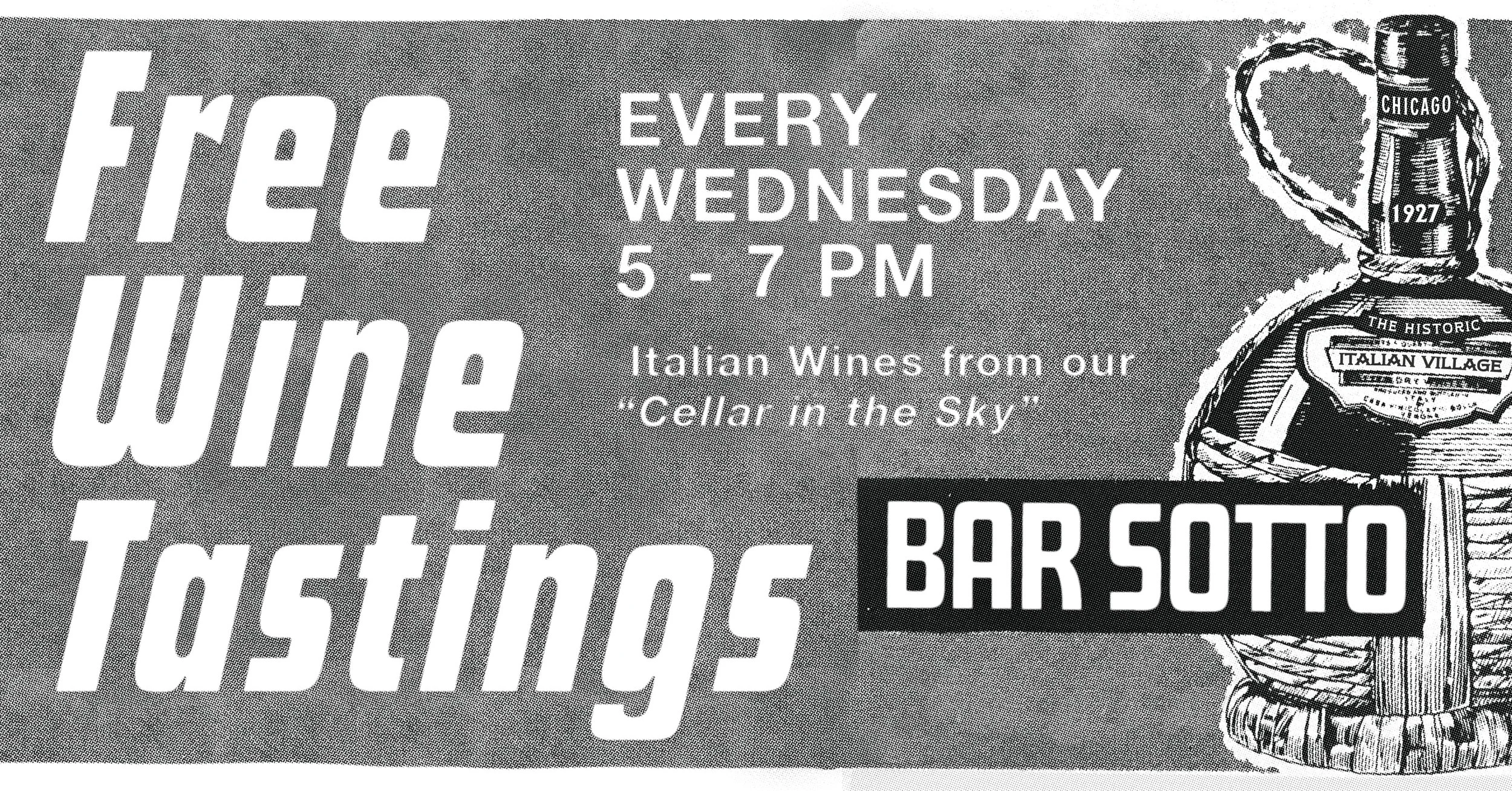 Chicago, IL, 60603Join us at Bar Sotto for free Italian wine tastings every Wednesday! Each week, wβll feature a different and unique Italian wine, offer a discount on glasses and bottles of what we're pouring, and share knowledge in a relaxed setting. Swing by to learn a little something new and taste the vino vibes.